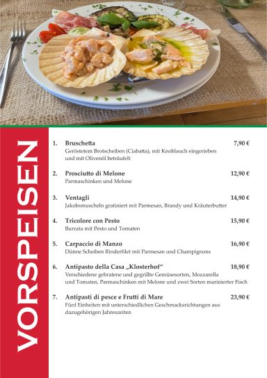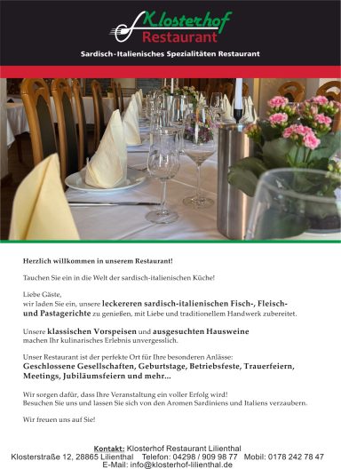 Willkommen im Klosterhof Restaurant Lilienthal! Unsere italienische Küche bietet Ihnen eine Vielzahl von köstlichen Gerichten, die Sie begeistern werden. Von frischen Pasta über zarte Fleischgerichte bis hin zu verlockenden Desserts – unsere Speisekarte lässt keine Wünsche offen. Laden Sie sich unsere komplette Speisekarte als PDF herunter, um alle unsere kulinarischen Highlights bequem zu Hause zu durchstöbern. Ob Sie in unserem Restaurant speisen oder Ihr Essen mit nach Hause nehmen möchten, bei uns finden Sie immer die perfekte Auswahl für jeden Geschmack. Genießen Sie die authentic italienische Küche im Klosterhof und lassen Sie sich von unserem freundlichen Service verwöhnen!